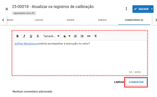 Preencha o campo com o texto desejado, e se preferir utilize o "@" para selecionar o colaborador que deverá ser notificado por e-mail a respeito deste comentário. Na sequência clique em "Comentar".
