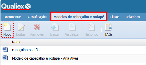 Para enviar um novo modelo de cabeçalho e rodapé é necessário ter a permissão "Listar" e "Cadastrar" no Modelos. Definido em Configurações Clássicas > Papéis.
