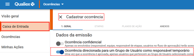 No momento da aprovação da ocorrência, pela caixa de entrada, você encontrará a opção de direcionar temporariamente a responsabilidade para um grupo de usuários. Basta selecionar "Ocorrência direcionada para um grupo como responsável temporário" ao cadastrar a ocorrência.