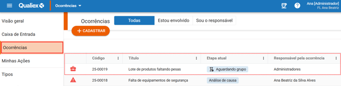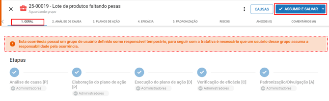 A partir desse ponto, apenas usuários envolvidos ou integrantes do grupo conseguem visualizar e interagir com a ocorrência, e o grupo permanece responsável até que algum membro assuma a tratativa, sendo exibido como responsável tanto pela ocorrência quanto pela etapa, até que haja uma definição individual.