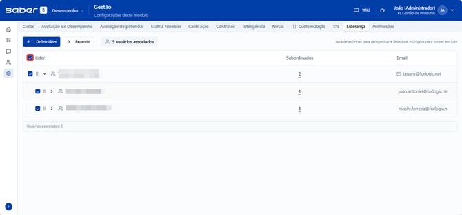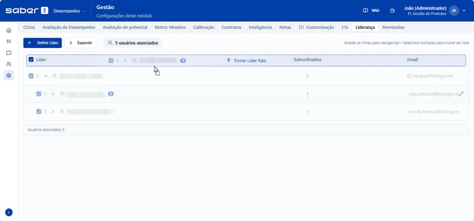 - Há a possibilidade de de edição de líderes e liderados através das caixas de seleção ou pelo método de "arrastar" algum colaborador para liderança