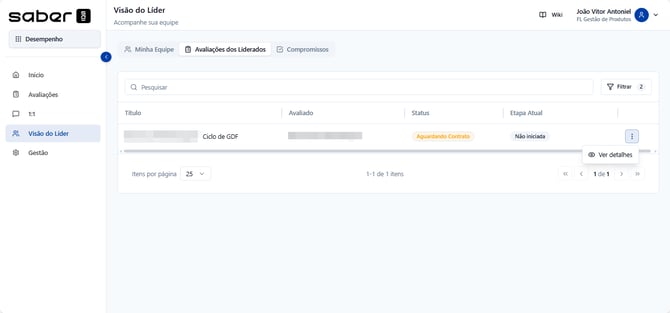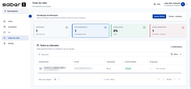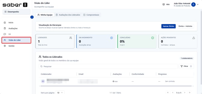 A Visão do Líder é uma área centralizada e estratégica, projetada para que os gestores possam acompanhar de perto o andamento das avaliações, contratos de desempenho e feedbacks das suas equipes.
