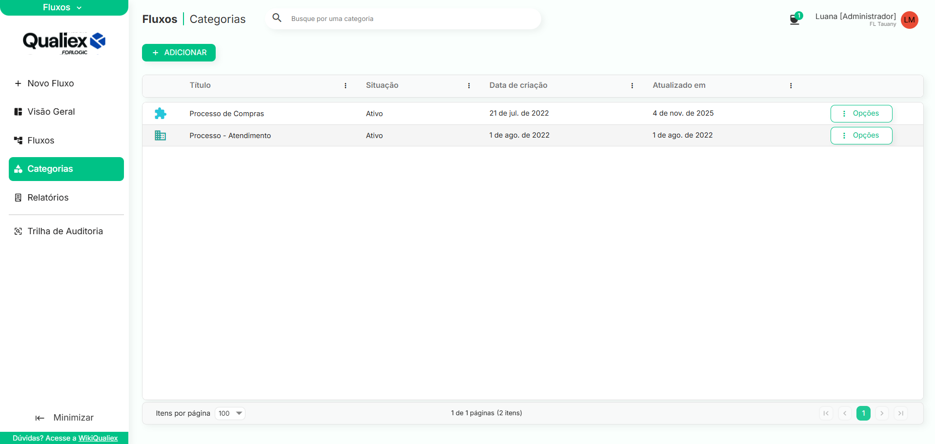 As Categorias do módulo Fluxos organizam e padronizam os processos da organização.