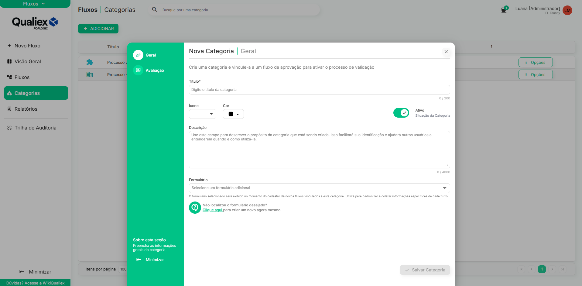 Aprenda a criar, editar e remover categorias no módulo Fluxos, configurando cores, ícones, formulários adicionais e fluxos de aprovação personalizados.