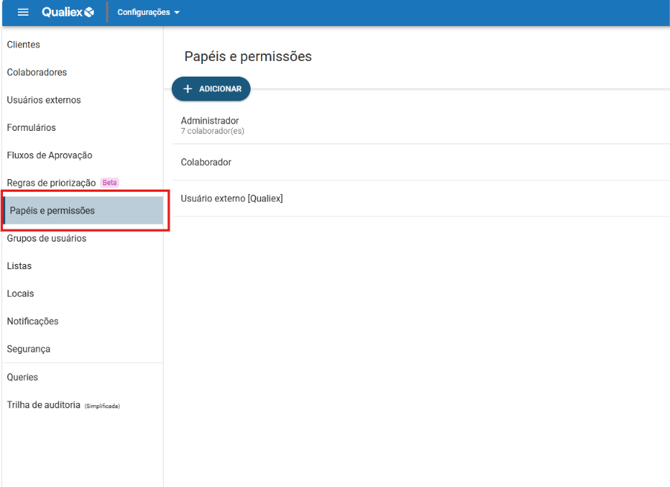 - Na tela Papéis e Permissões, clique no botão “+ Adicionar”.