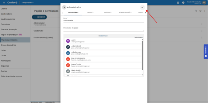 O Qualiex utiliza um modelo de permissões granulares, no qual os papéis (ou perfis de acesso) são criados livremente pela organização.