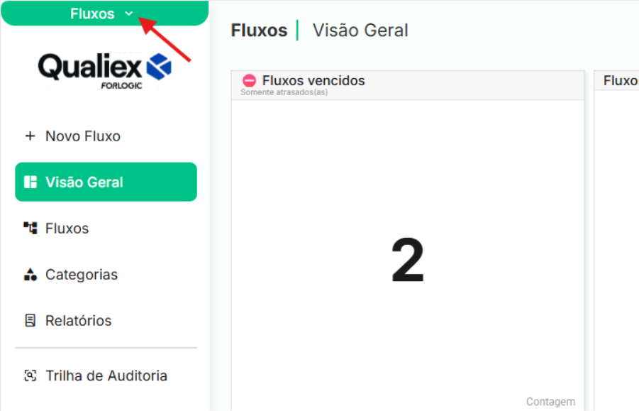 - No canto superior esquerdo da tela, clique na seta para baixo ao lado do nome do módulo em que você está (neste exemplo, "Fluxos").