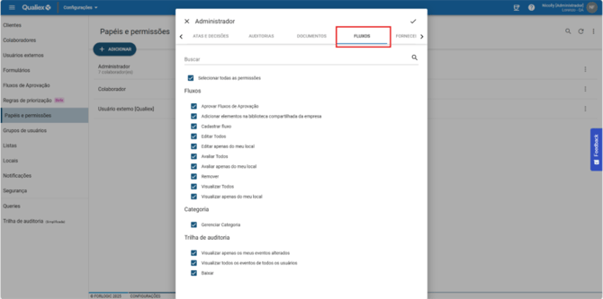 As permissões do módulo Fluxos definem o que cada usuário pode fazer, desde criar fluxos até aprovar, editar, visualizar e consultar a trilha de auditoria.