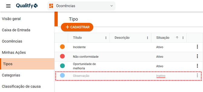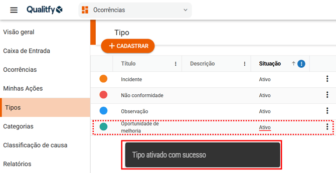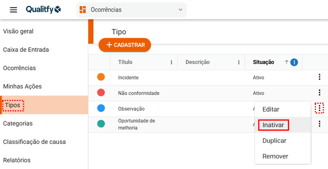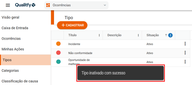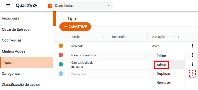 Como Inativar e Ativar um Tipo de Ocorrência no Qualitfy?