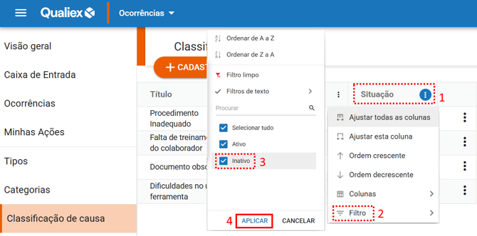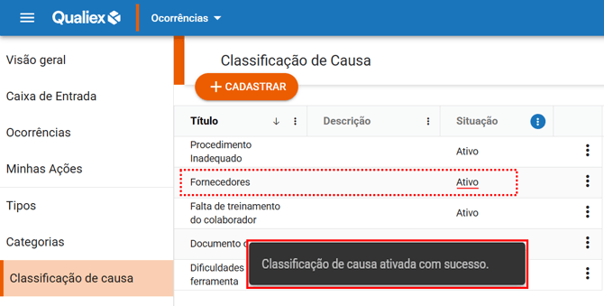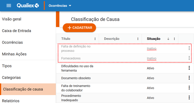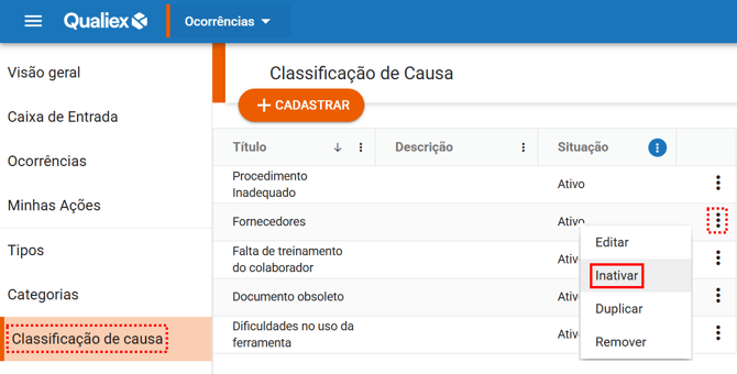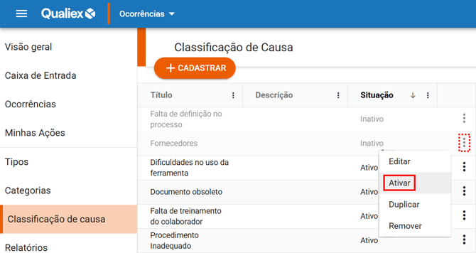 Como inativar e ativar uma Classificação de Causa no Qualiex?