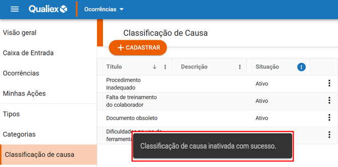 Em alguns casos, uma classificação de causa previamente cadastrada e utilizada no módulo de Ocorrências pode deixar de ser adequada, devido a atualizações ou mudanças nos processos da organização