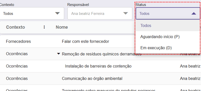 Status: Permite filtrar as ações conforme o status atual, como: