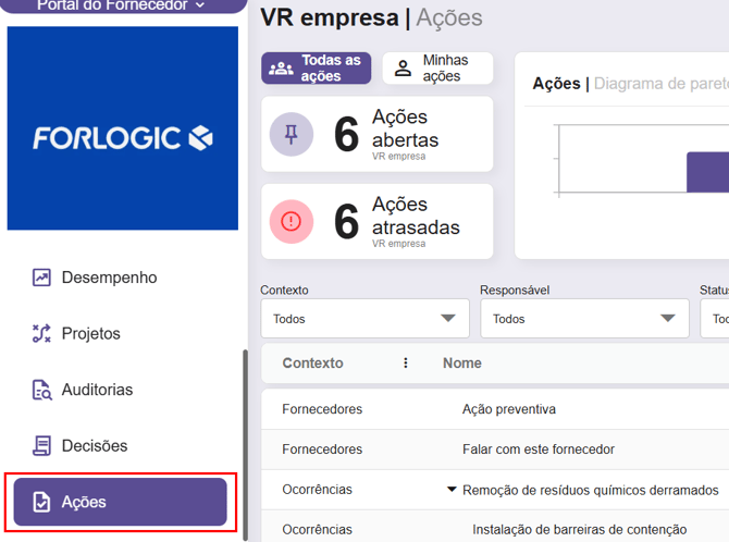 Na aba Ações, o usuário externo, vinculado a um fornecedor, pode acompanhar todas as ações relacionadas ao fornecedor que estejam em aberto ou em atraso, independentemente do módulo de origem. Isso inclui ações provenientes de avaliações de desempenho, não conformidades, planos de melhoria e outras tratativas associadas ao relacionamento com o fornecedor.