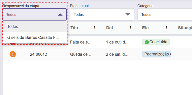 Ao selecionar ambos os painéis, é possível aplicar um filtro por responsável por etapa, permitindo escolher os usuários encarregados das etapas das ocorrências.