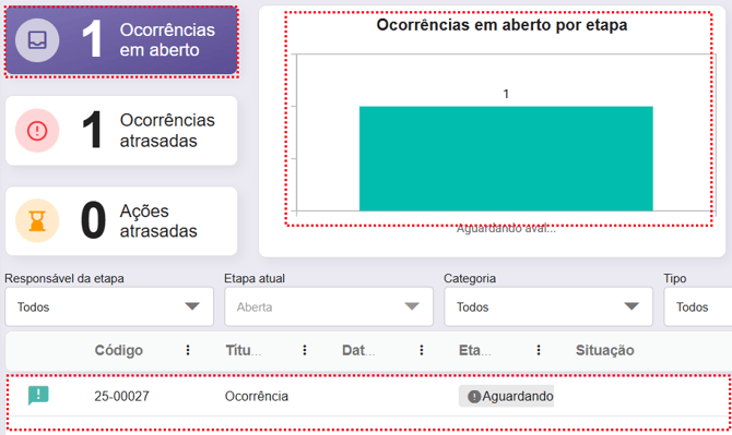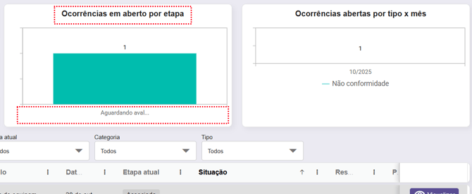 O painel de ocorrências em aberto por etapa mostrará quantas ocorrências estão em cada fase da tratativa.