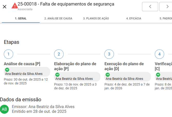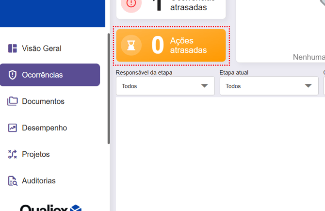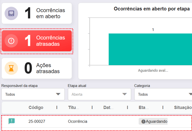 Quando você clica no painel de ações atrasadas, todas as ocorrências com ações atribuídas ao usuário e com o status 'atrasada' são exibidas abaixo.