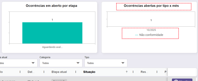 O painel de Ocorrências Abertas por Tipo x Mês exibe quantas ocorrências foram registradas por tipo durante o mês.