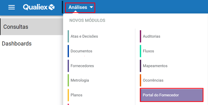 Após preencher corretamente os dados de login e entrar no sistema, o usuário poderá acessar o menu de módulos e selecionar o Portal do Fornecedor, desde que este esteja devidamente habilitado em seu cadastro: