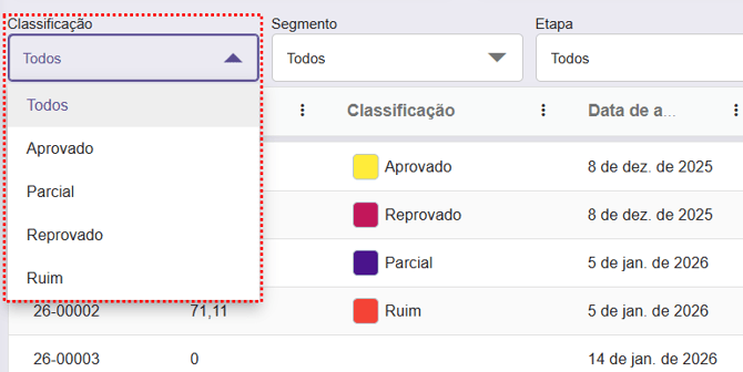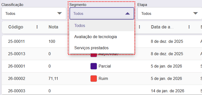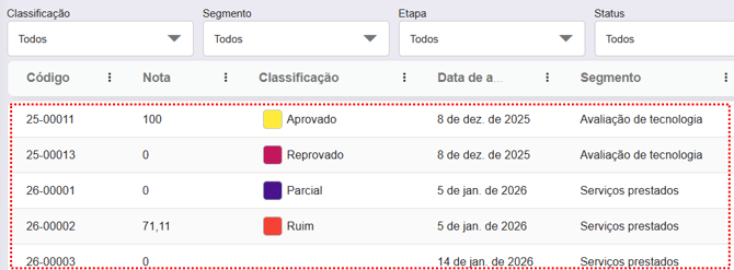 O usuário externo pode filtrar as avaliações por segmento, como tipo de serviço, produto ou categoria de fornecimento. Esse recurso facilita a análise do desempenho em áreas específicas, permitindo comparar resultados entre diferentes segmentos e identificar pontos fortes e oportunidades de melhoria em cada um deles.