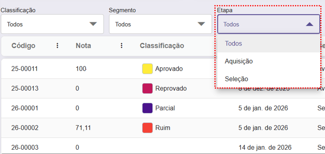 Etapa do processo, como seleção ou aquisição, focando apenas nas avaliações vinculadas a determinado tipo de processo.