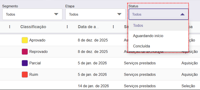 Status da avaliação, como “concluída” ou “aguardando início”, possibilitando visualizar apenas avaliações finalizadas ou aquelas que ainda serão realizadas.