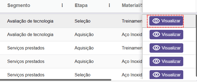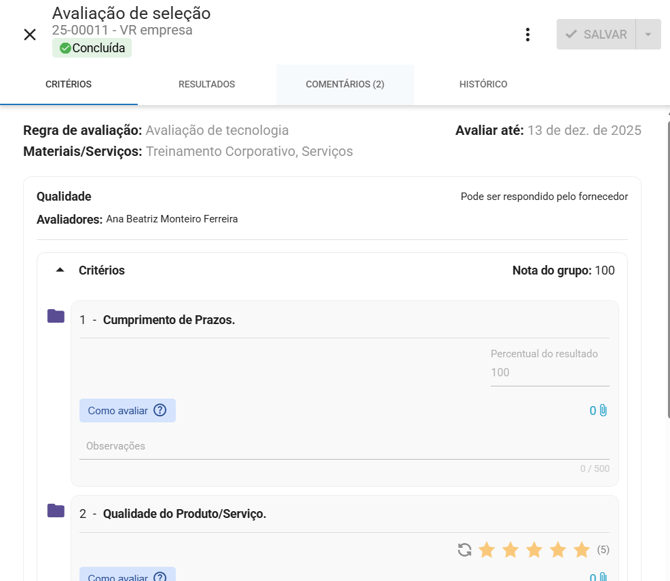 disponível ao lado de cada avaliação, o usuário externo é redirecionado para os detalhes da avaliação no módulo Fornecedores. Nessa tela, é possível consultar todas as informações relacionadas à avaliação, incluindo critérios avaliados e registros associados.