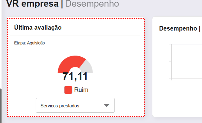 Na seção Última Avaliação, o usuário externo visualiza a avaliação mais recente realizada para o fornecedor ao qual está vinculado. São apresentadas informações como a nota obtida, a classificação do desempenho e a etapa do processo em que a avaliação foi realizada, permitindo uma visão rápida da situação atual do fornecedor.