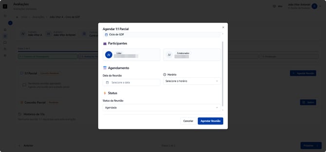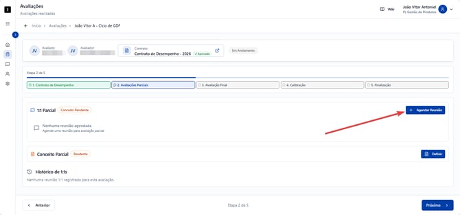 Logo no início da tela, na seção 1:1 Parcial, clique no botão azul + Agendar Reunião.