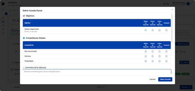 Comentários Gerais (Opcional): No final da janela, há um espaço livre para você adicionar observações gerais sobre a performance parcial do colaborador.