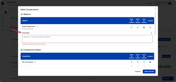 Ao avaliar os Objetivos: Logo abaixo das opções de notas de cada objetivo, existe um campo de comentário. Este campo é obrigatório (mínimo de 3 caracteres). Se você não preenchê-lo, a caixa ficará com a borda vermelha e o sistema impedirá o salvamento.