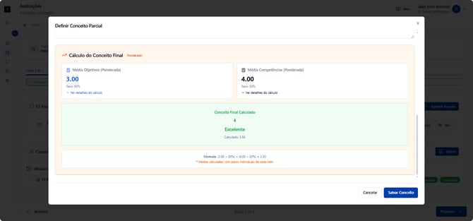 Conceito Final Calculado: É o resultado final consolidado. A fórmula geral utilizada pelo sistema junta os dois blocos (Objetivos e Competências) aplicando o peso de cada seção no ciclo, e funciona assim: