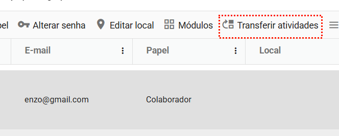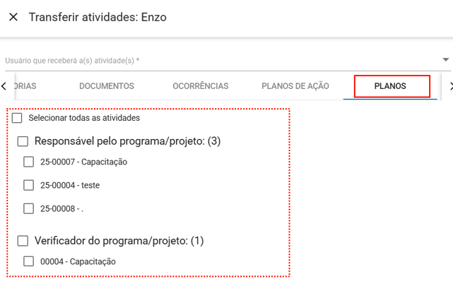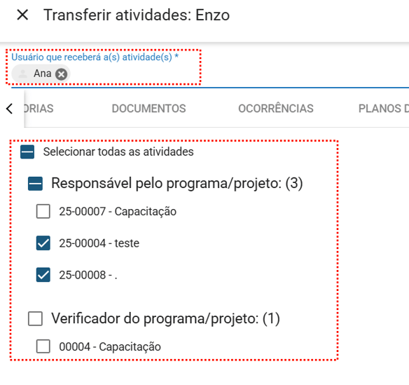 Para transferir, selecione as atividades desejadas e, em seguida, escolha o usuário que receberá as atividades pendentes do colaborador.