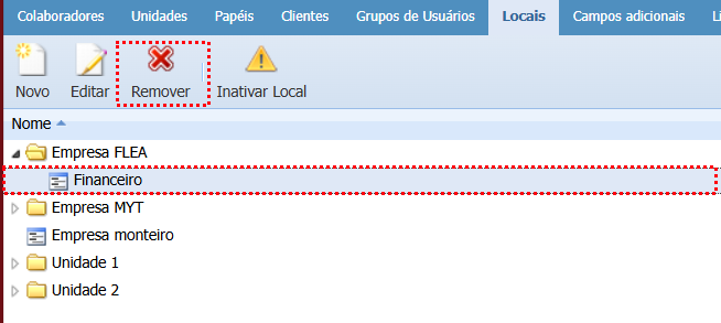 Para remover um local, é necessário ter permissão de "Listar" e "Remover" locais. Definido na aba Papéis > Configurações Clássicas.