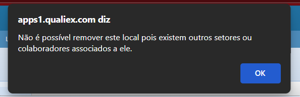 Caso o local esteja vinculado a algum colaborador, ou se for um local matriz com locais filhos, não será possível realizar a remoção imediatamente. Para excluir, primeiro desvincule todos os colaboradores relacionados a esse local. Se for um local matriz, remova primeiramente todos os locais filhos vinculados a ele.