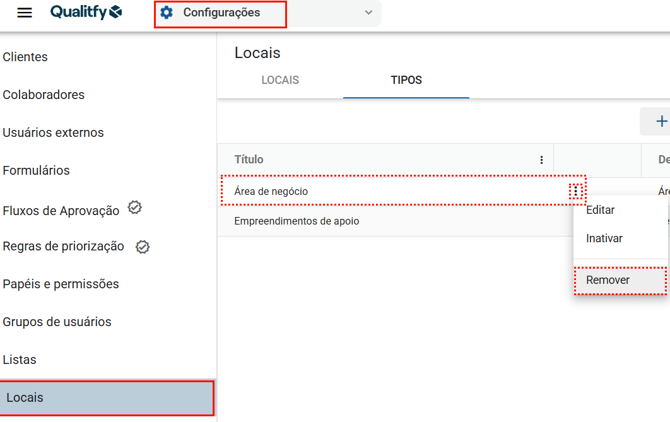 Na aba Locais, dentro do módulo Configurações, localize e selecione o Tipo de local que deseja remover. Você pode clicar no nome do Tipo com o botão direito do mouse ou acessar o menu de contexto