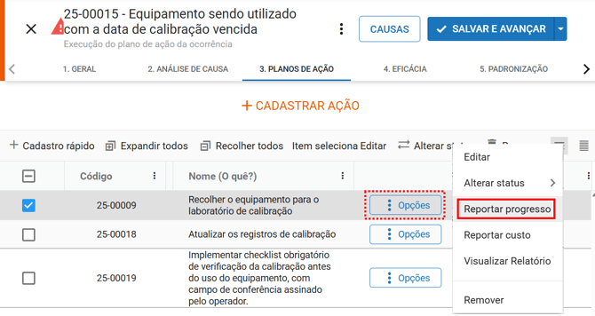 Como reportar progresso em uma ação da ocorrência no Qualiex?