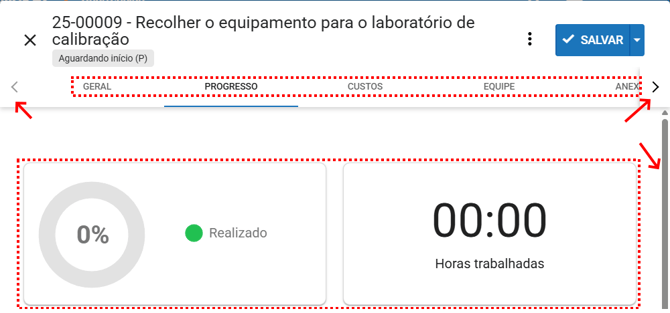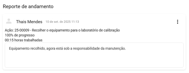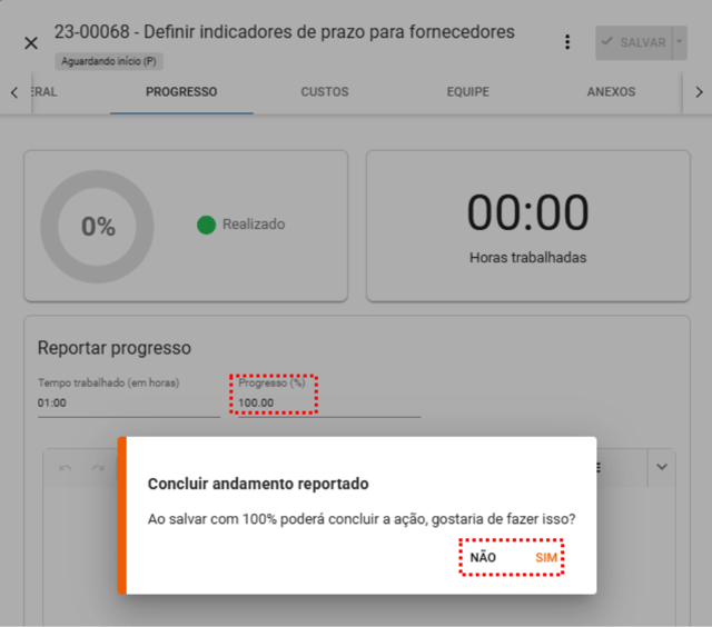 - Progresso (%): para informar a porcentagem de andamento da ação.
