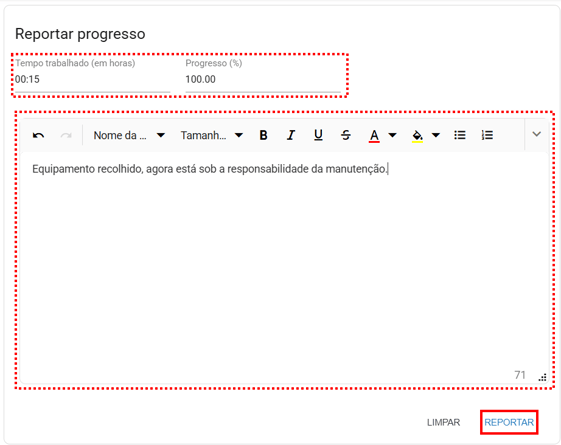 - Descrição: para informar detalhadamente o que foi feito até o momento do reporte.