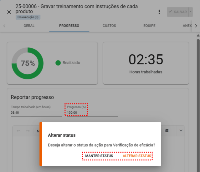 Ao reportar 100% de progresso em uma ação que possuí um responsável pela verificação de eficácia, o sistema pergunta se gostaria de alterar o status para “Verificando eficácia”.