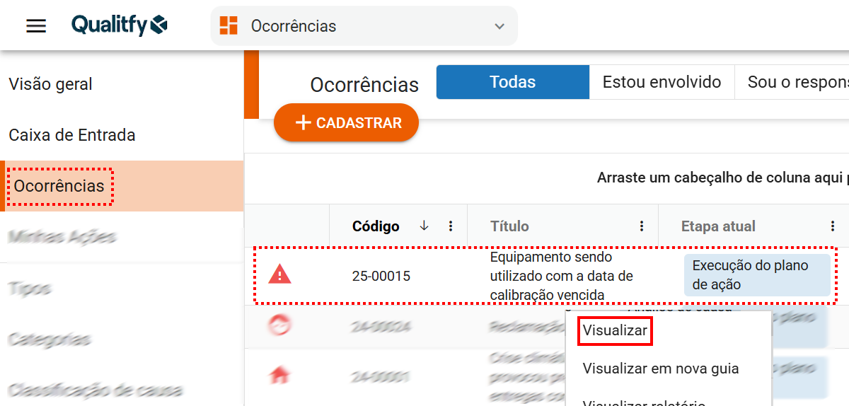 Clique na aba "Ocorrências", localize a ocorrência desejada e na sequência clique na ocorrência com o botão direito do mouse, ou, clique no menu de contexto e  em ”Visualizar”.