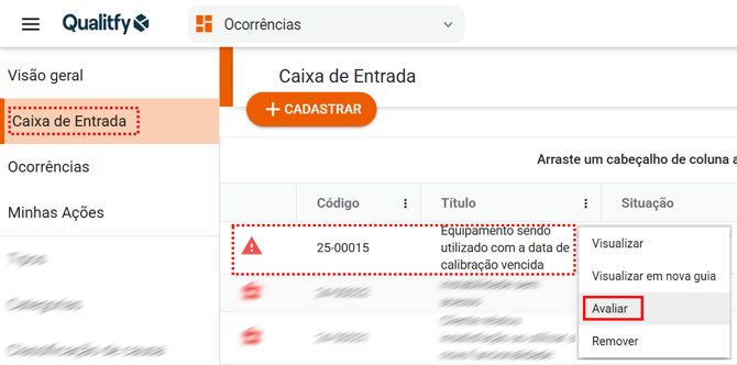 Clique na aba "Caixa de entrada", na sequência clique na ocorrência desejada com o botão direito do mouse, ou, clique no menu de contexto