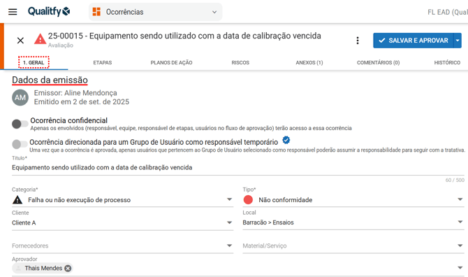 - O aprovador poderá revisar e editar os dados preenchidos na descrição da ocorrência, dos campos: título, categoria, tipo, cliente, local, fornecedores, material/serviço, aprovador, descrição.