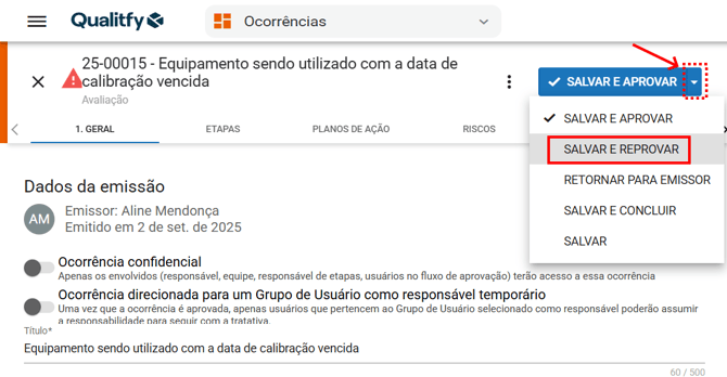 Ao concluir a avaliação e perceber que, de acordo com o processo da sua empresa, a ocorrência não deve ser tratada, você poderá REPROVAR e manter o registro de rastreabilidade das informações.