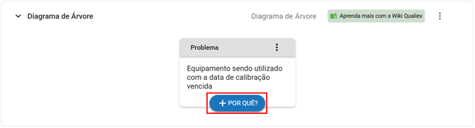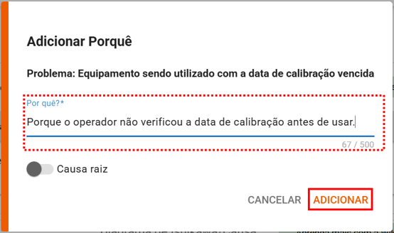 Com a ferramenta adicionada, clique em para inserir os porquês. Será exibida a tela para preenchimento de um porquê.