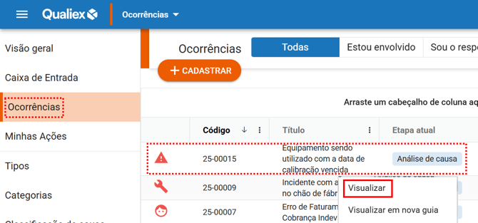 Clique na aba "Ocorrências", na sequência clique na ocorrência desejada com o botão direito do mouse, ou, clique no menu de contexto e em ”Visualizar”.