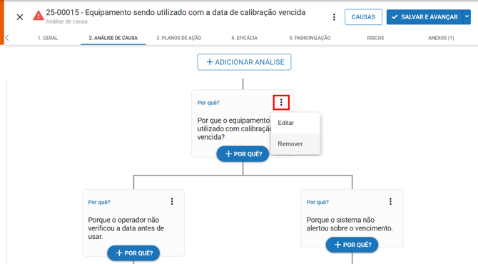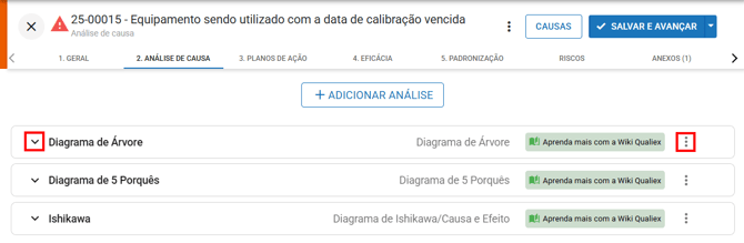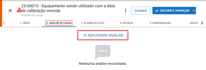 Na etapa de Análise de Causa, clique em "Adicionar Análise" para escolher qual ferramenta utilizar.