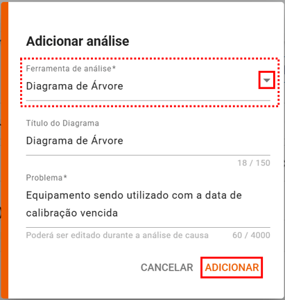 - Ferramenta de Análise (obrigatório): será possível escolher entre Diagrama de Ishikawa, Diagrama de Árvore ou 5 Porquês.