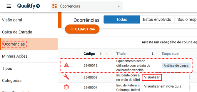 Clique na aba "Ocorrências", na sequência clique na ocorrência desejada com o botão direito do mouse, ou, clique no menu de contexto e  em ”Visualizar”.