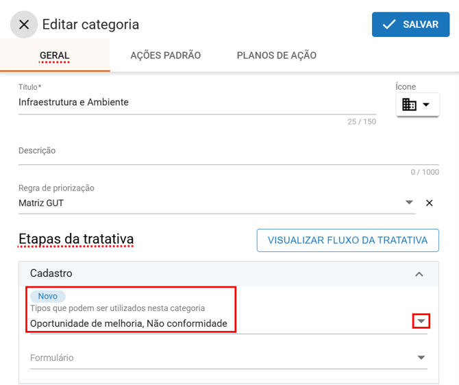 Essa configuração é feita diretamente na aba Categorias, permitindo que cada categoria tenha os tipos adequados, de acordo com suas particularidades