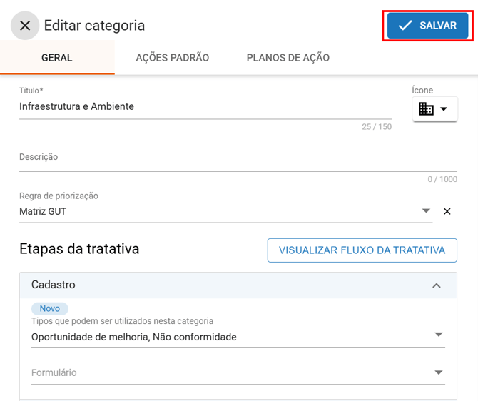 Ao selecionar a opção de "Editar", uma janela será aberta, permitindo realizar alterações na categoria. Na aba "Geral" localize as "Etapas da Tratativa".
